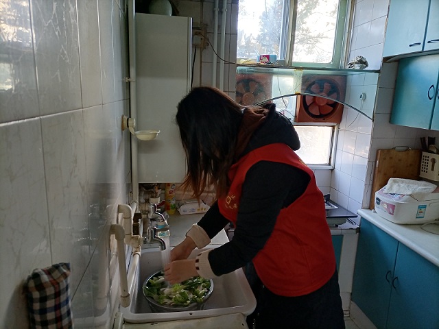 青年志愿者服務(wù)隊(duì)來到退休老職工家中,與職工們拉家常,了解他們的身體狀況和生活情況,并幫助他們打掃衛(wèi)生、清洗蔬菜。
